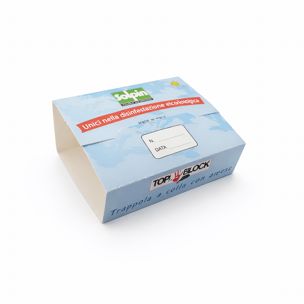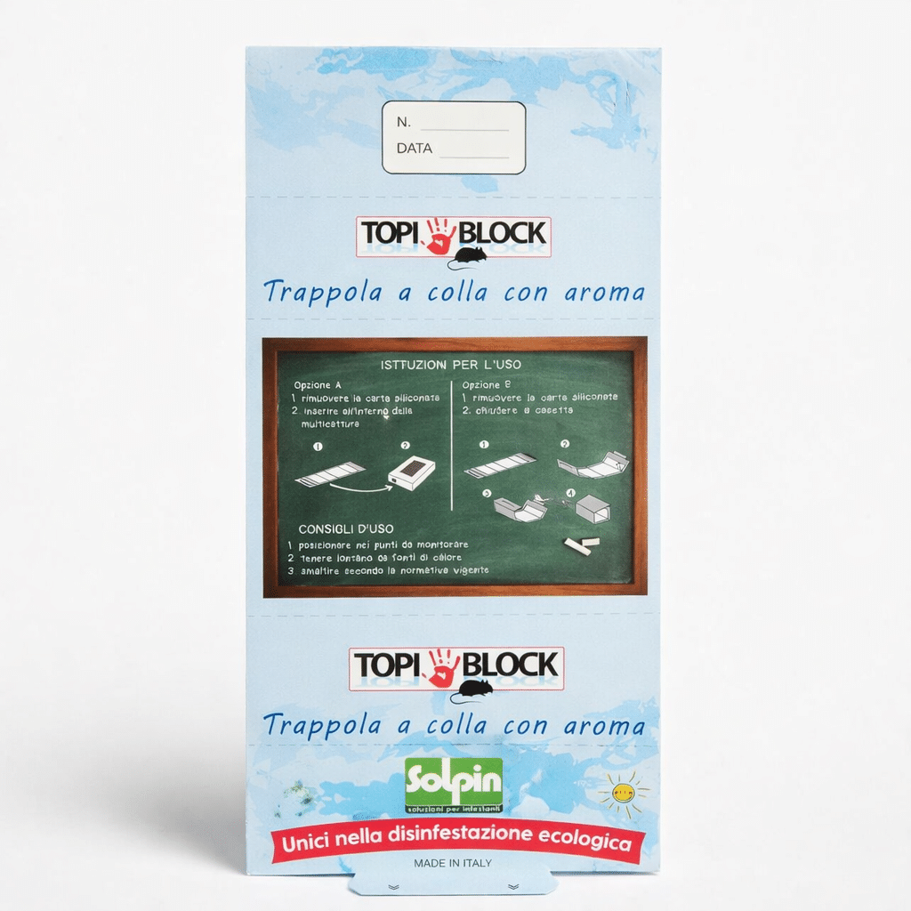 Întreaga suprafață de lipici este impregnată cu agenti de atracție care nu contin si nu dezvolta substante toxice. Capcana Topi Block poate fi utilizată în interiorul dispozitivelor: Twin Mouse, Twin Box, Top Rat Duo și Twin Plast sau poate fi utilizată deschisă sau închisă ca o casă prin plasarea ei în zona de trecere a rozatoarelor.