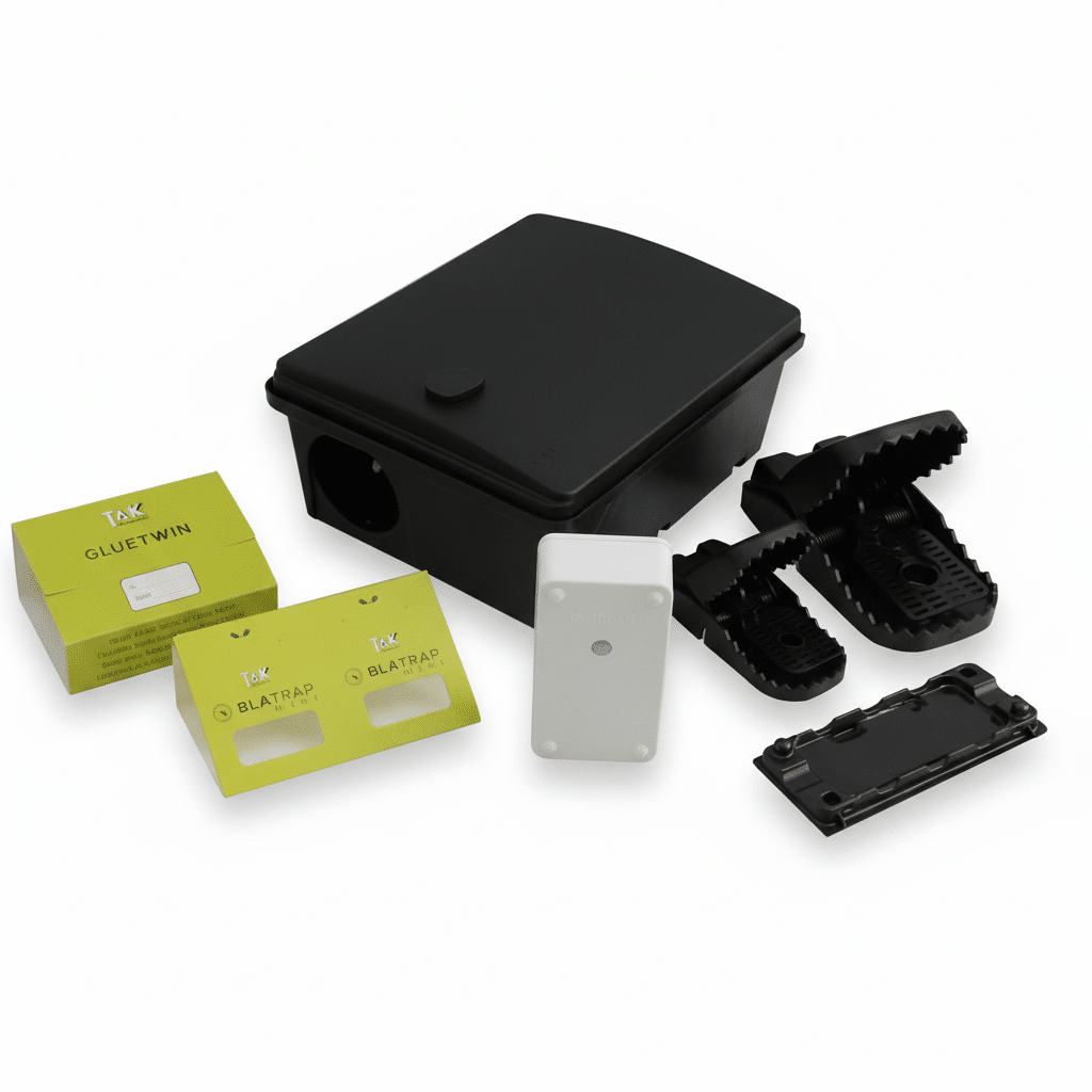 • capcană pentru șoareci cu card de adeziv Glue Twin închis ca o casă (cod 3135 și cod 3136) • Capcană pentru insecte târâtoare cu 2 Blatrap Mini unite și închise ca o casă (cod 3213)